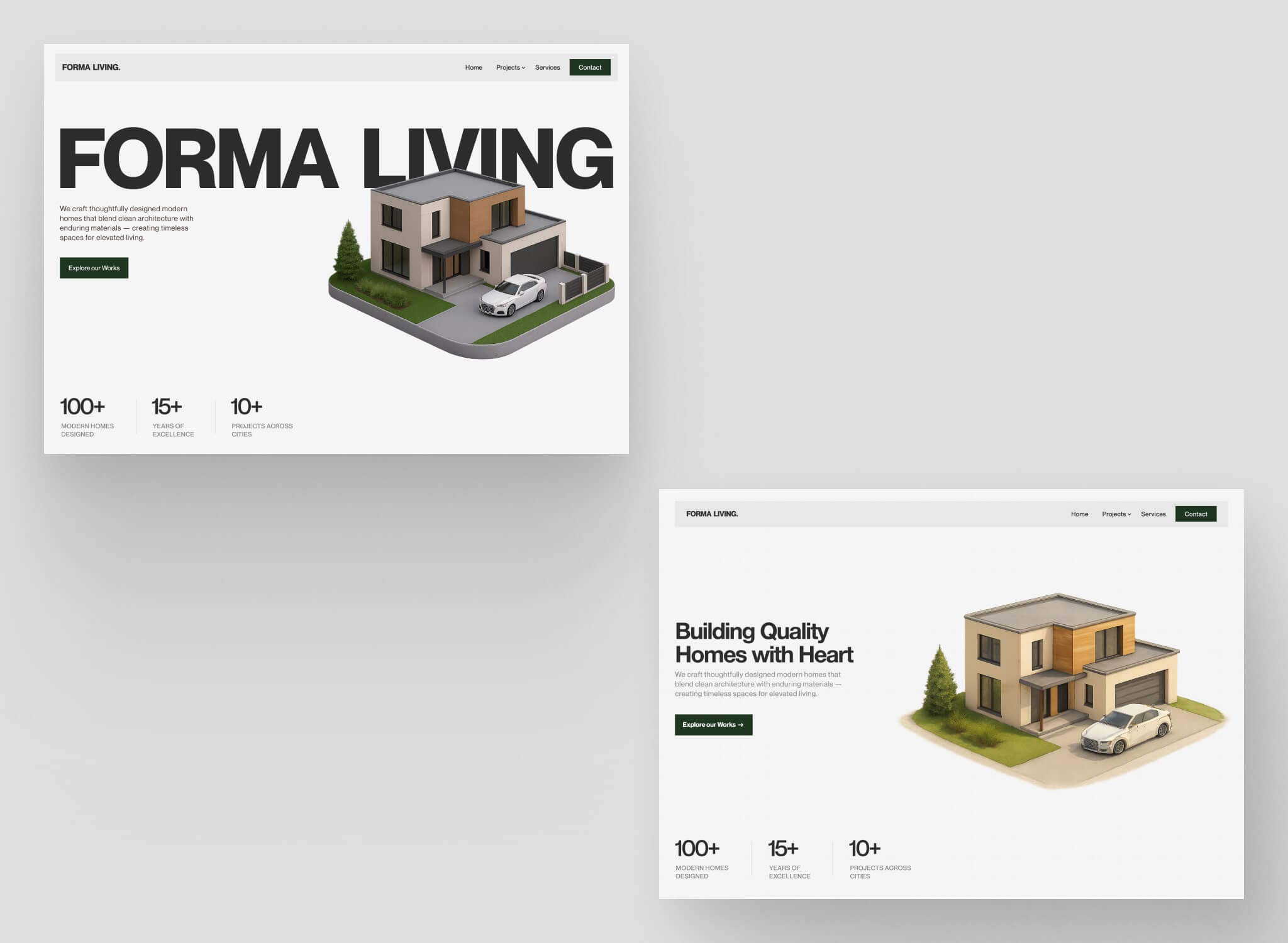 Forma Living is a construction company website showcasing residential and commercial projects with a clean, professional design.